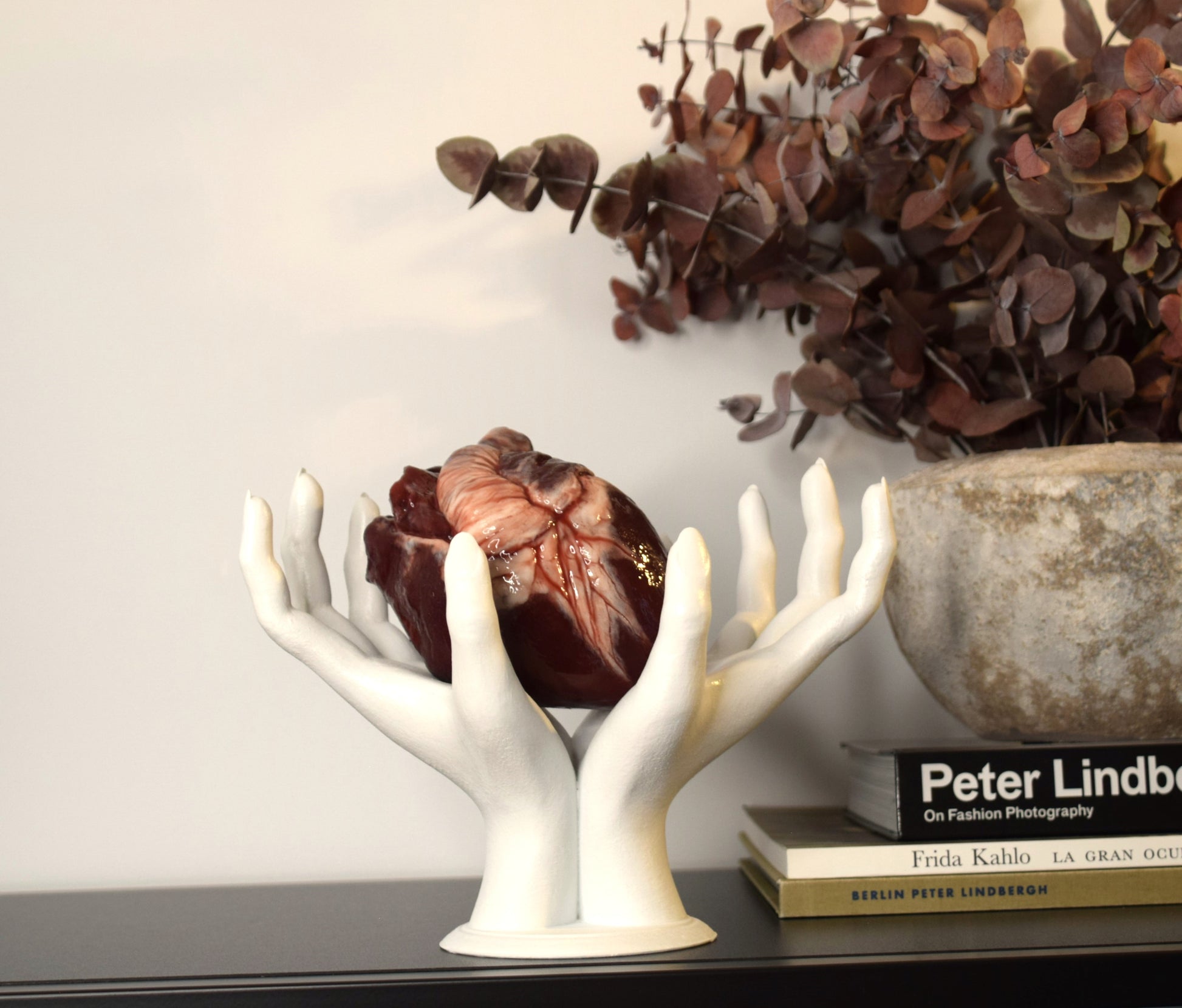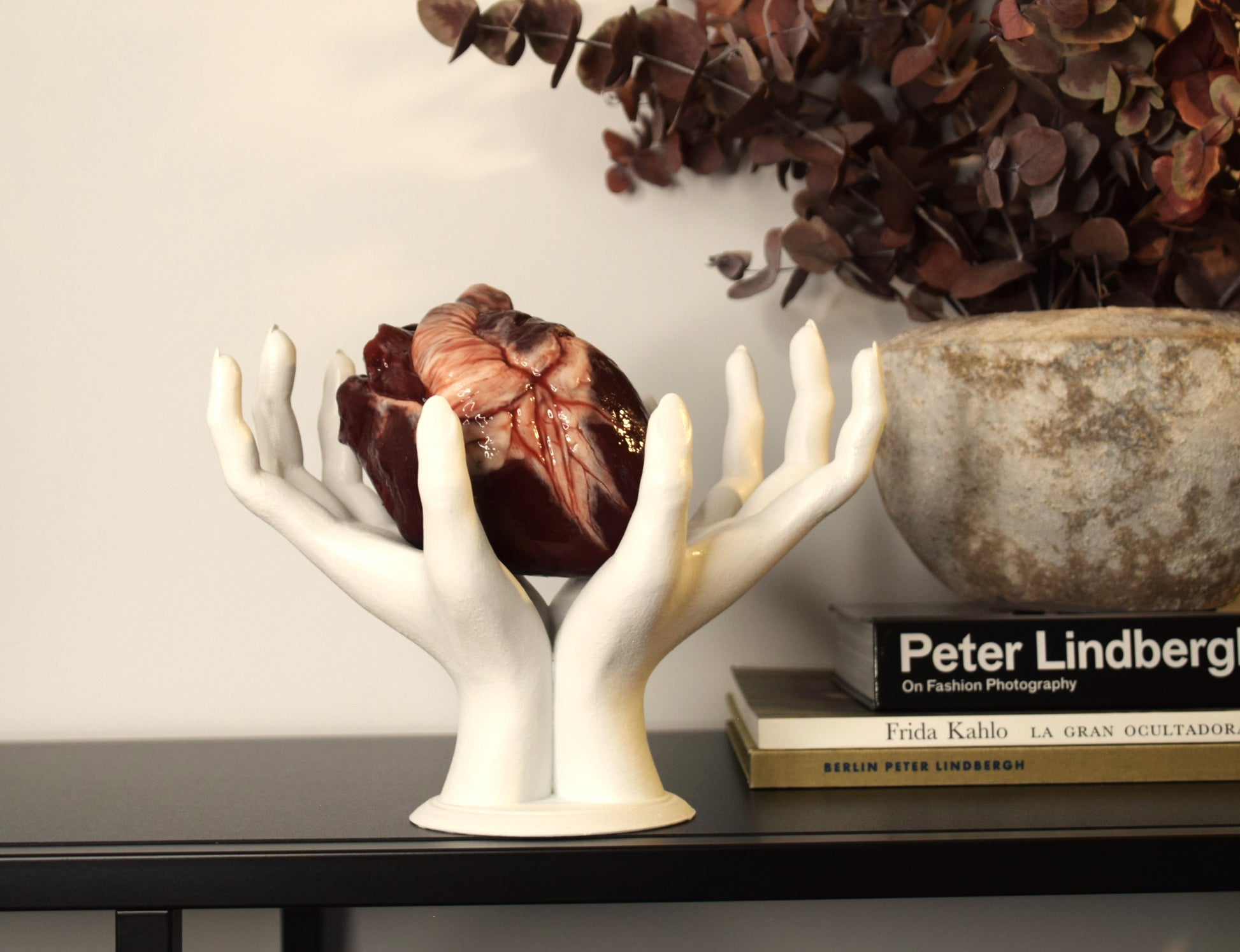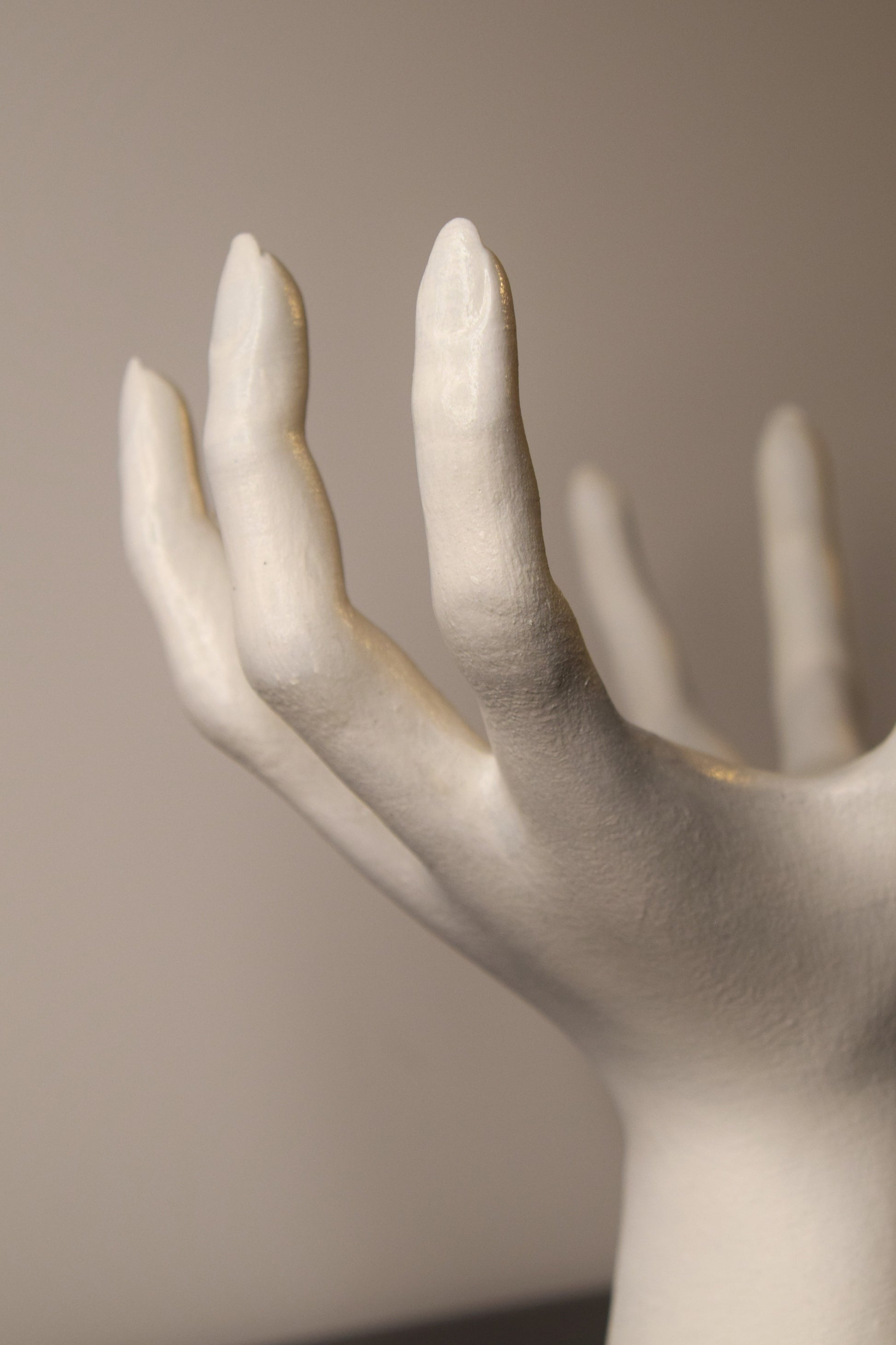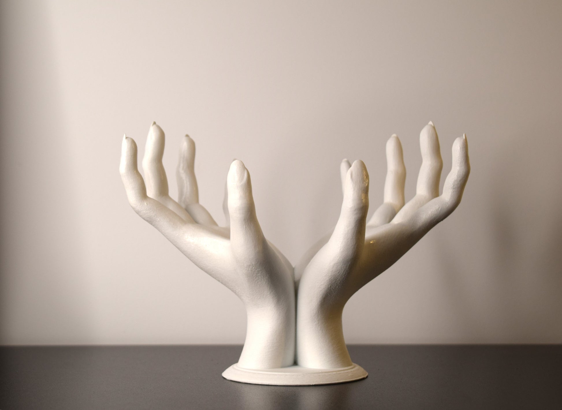 This life-size sculpture features realistic female hand proportions and works both as functional holder and decorative art piece.